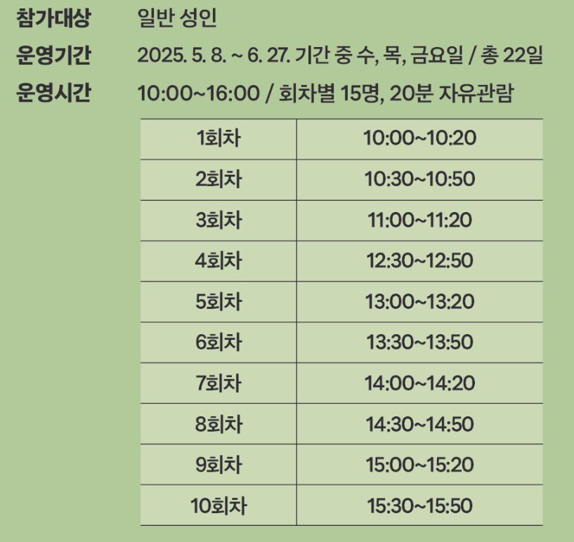 - 관람 시간: 오전 10시~오후 4시 (20분 간격, 총 10회차)