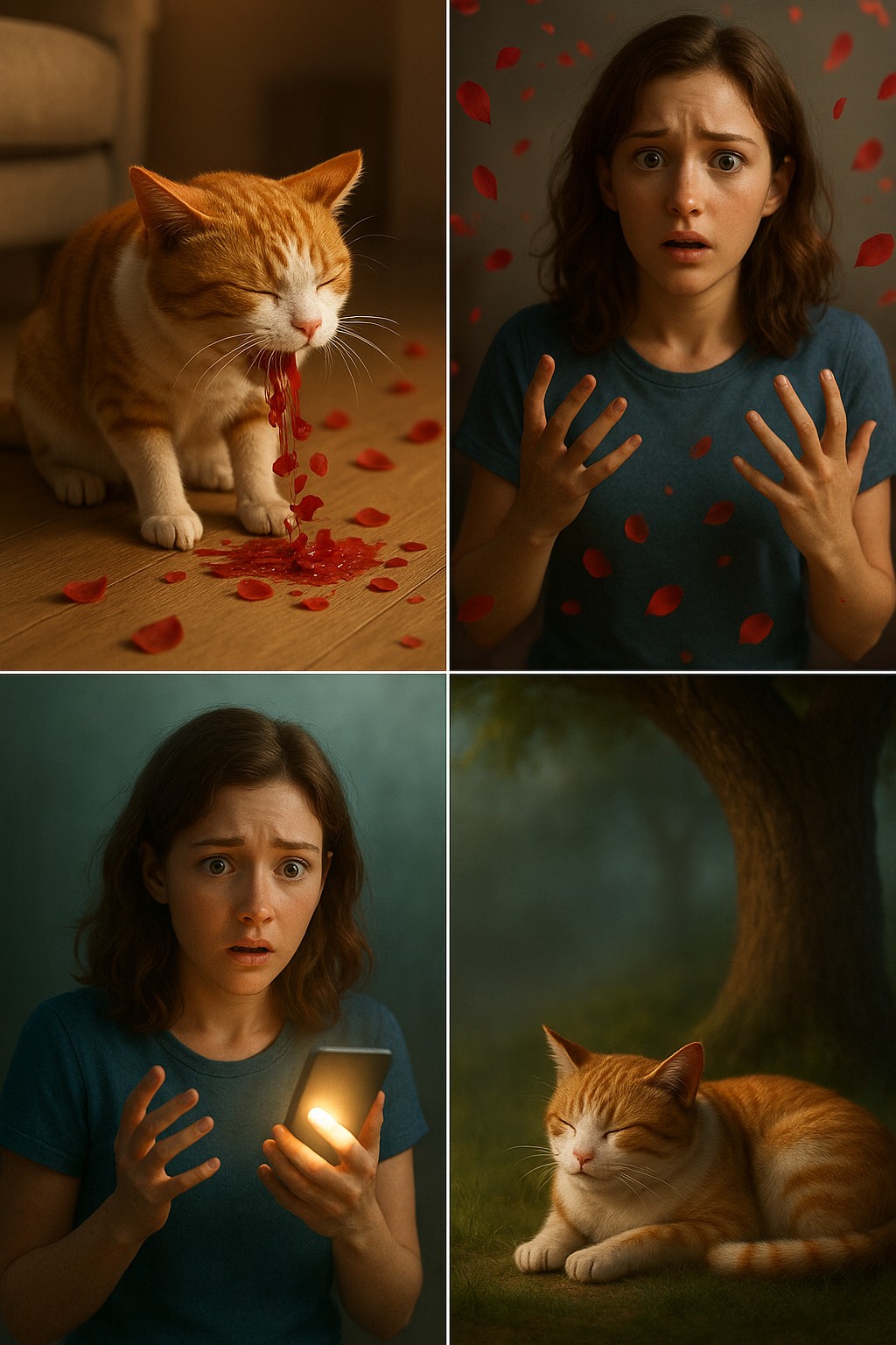 - 고양이는 애착 대상, 혹은 당신 자신의 감정적 부분의 대리물입니다. 고양이가 피를 토하고 쓰러지는 장면은 억압된 감정, 특히 분노나 슬픔이 외부로 터져 나오려는 상징입니다.