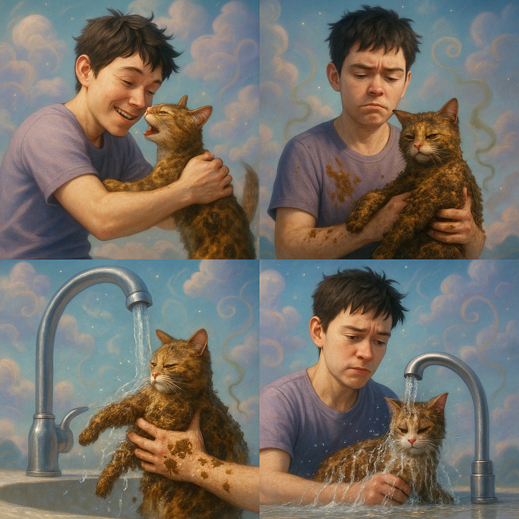 그러나 그것이 '똥칠'된 모습으로 나타났다는 건, 그 감정이 부끄럽거나 외면하고 싶은 형태였다는 걸 의미해요. 하지만 당신은 이를 거부하지 않고 씻어주려 했고, 이 점은 내면 정화의 진전, 자아 성숙의 신호라고 볼 수 있습니다.