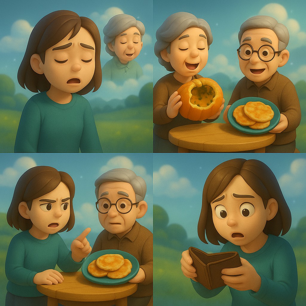 돌아가신 부모님을 통해 당신은 현재 삶의 무게와 내면의 공허함, 혹은 해결되지 않은 감정들과 마주하고 있습니다. 그리고 '썩은 호박'이라는 소재를 통해 지나간 시간에 대한 회한과 현재의 불안함이 드러납니다. 그러나 동시에 그 썩은 재료로도 뭔가를 만들어 먹이려는 부모님의 모습은, 어떤 식으로든 사랑을 전달하고자 했던 그들의 진심이 느껴지기도 해요.
