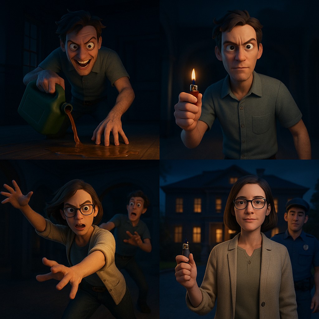 어떤 사람이 미쳐서 모두를 죽이겠다고 큰 집에 기름을 붓고 라이터로 불을 내려는 상황.