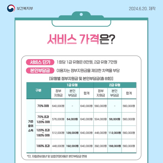 정부가 최대 100% 지원하며, 소득에 따라 본인 부담금이 차등 부과됩니다.