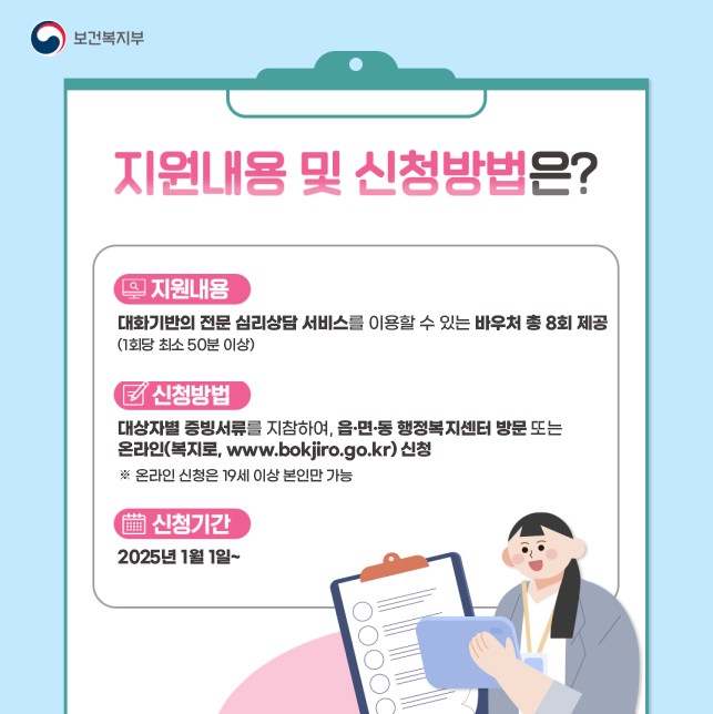 정신건강 문제를 예방하고 회복을 돕기 위해 보건복지부가 2024년부터 본격적으로 시행하고 있으며, 2025년에는 더욱 확대·개선된 형태로 운영됩니다.